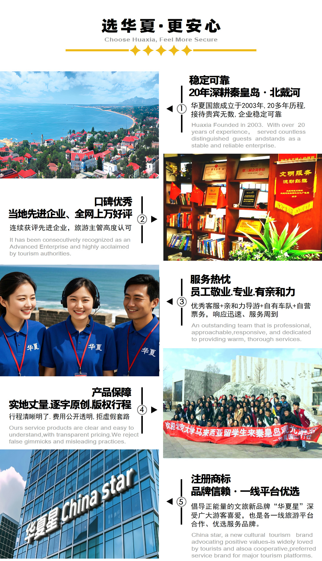 ·China Star & Qinhuangdao Huaxia International Travel Service Co., Ltd. has focused on Qinhuangdao & Beidaihe — the cradle of China’s tourism industry and a renowned coastal destination — for over 20 years. Founded in 2003, it offers travel convenience and services to distinguished guests worldwide, and is a local tourism enterprise with a long service history and strong reputation. Its office is located on the 2nd floor of the International Building at Sheraton Complex, a five-star landmark in Beidaihe. Contact Email: 1016229918@qq.com