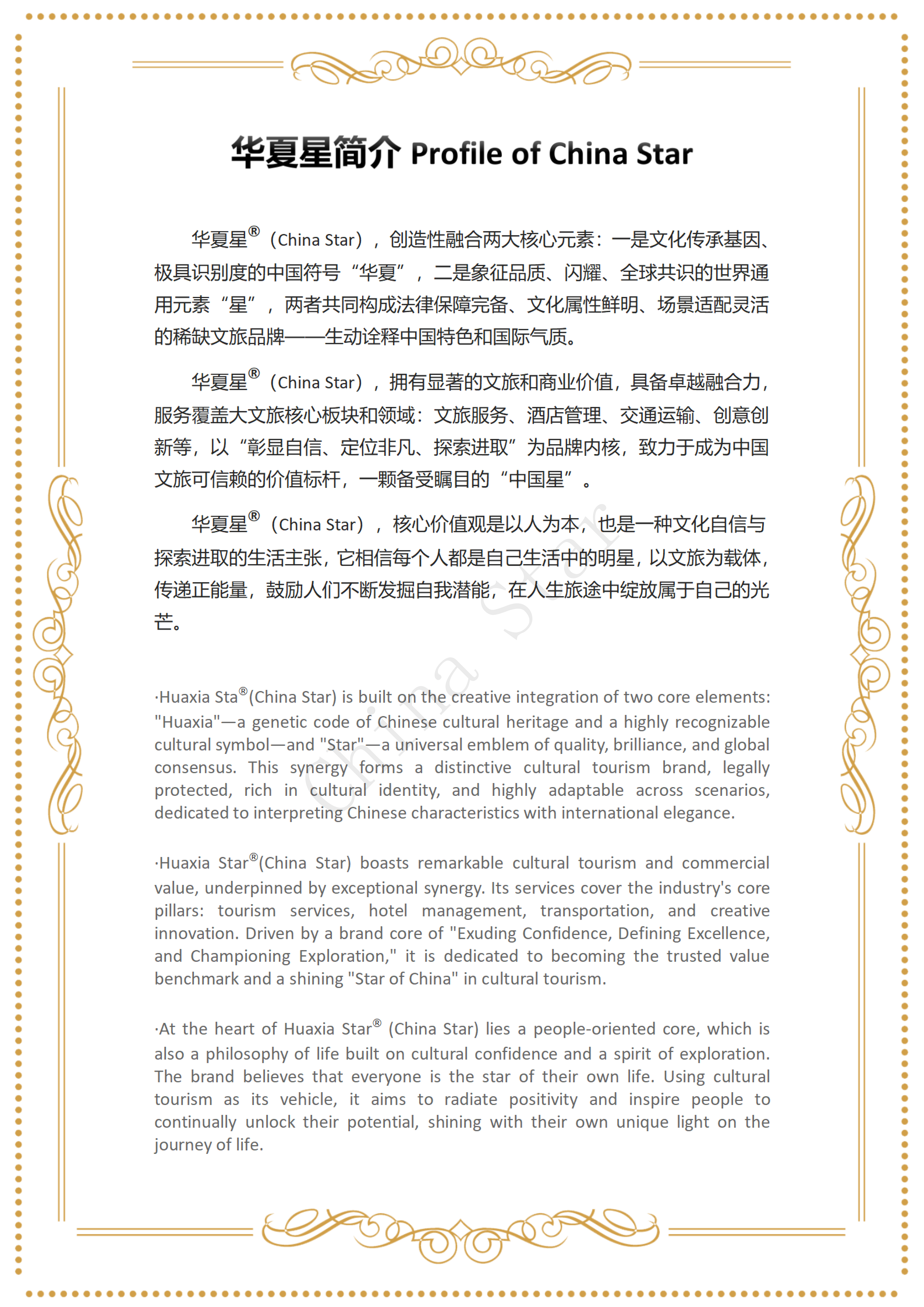 我们坚信,中国品质文旅的未来,应根植中华优秀文化,坚定不移走“中国特色兼具国际化表达”道路。“华夏星·China Star”正是为有志于打造“中国特色高端文旅标杆”的伙伴而生。