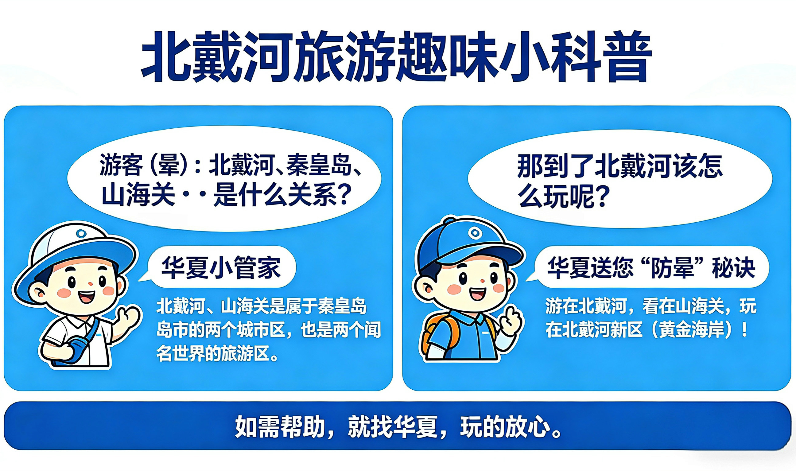 如需帮助,就找华夏,玩的放心!秦皇岛华夏国际旅行社,为您提供一站式旅游服务,定制专属行程、预订门票住宿、全程导游陪同,让您的北戴河之旅彻底「防晕」,省心畅游!